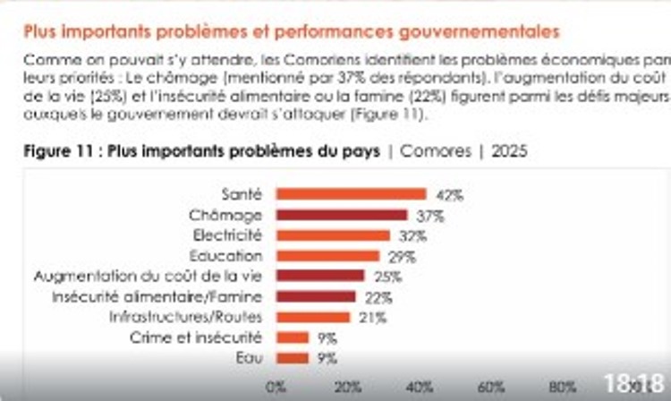 En 25 ans, l’indice du développement humain (Idh) a lentement évolué, passant de 0,510 en l’an 2001 à (141ème rang sur 186 pays) à 0,586 (152ème sur 193 pays) en 2025, selon des données fournies le Commissariat général au Plan (CGP). Classées parmi les Pma (Pays moins avancés), les Comores ont été classées « pays à revenus intermédiaires » depuis 2019 de la tranche inferieure par la Banque mondiale dans sa classification des 46 Pma. Mais l’institution estime que l’économie reste encore fragile avec « une pauvreté modérée » mais qui risque de s’accentuer faute de politiques pour promouvoir la compétitivité du secteur privé, considéré comme un potentiel créateur de richesses et un pourvoyeur d’emplois. « La majorité des Comoriens disent avoir au moins « quelques fois » manqué de revenus en espèces (74%), de nourriture (59%), de soins médicaux (56%), d’eau potable (53%) et de combustible pour la cuisson (53%) pendant les 12 derniers mois qui ont précédé l’étude », souligne Afrobarometer dans sa dernière enquête aux Comores.